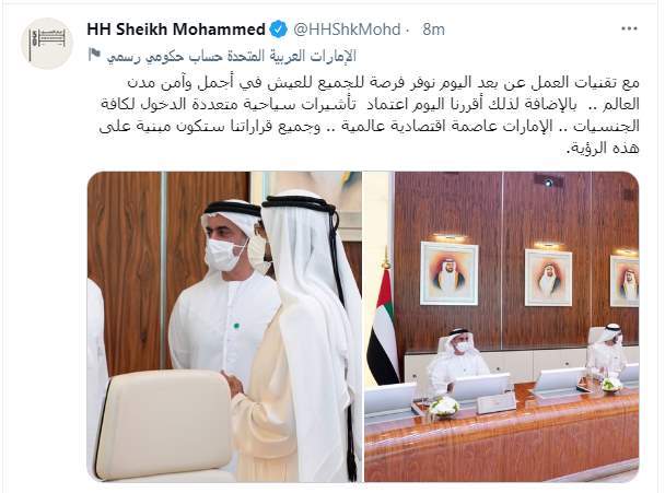 وقال "مع تقنيات العمل عن بعد اليوم نوفر فرصة للجميع للعيش في أجمل وآمن مدن العالم.. بالإضافة لذلك أقررنا اليوم اعتماد تأشيرات سياحية متعددة الدخول لكافة الجنسيات .. الإمارات عاصمة اقتصادية عالمية .. وجميع قراراتنا ستكون مبنية على هذه الرؤية".