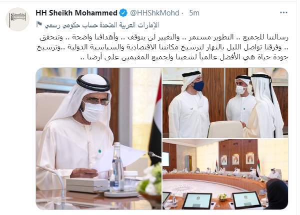 واختتم رسالته قائلًا: "رسالتنا للجميع.. التطوير مستمر.. والتغيير لن يتوقف.. وأهدافنا واضحة.. وتتحقق.. وفرقنا تواصل الليل بالنهار لترسيخ مكانتنا الاقتصادية والسياسية الدولية..وترسيخ جودة حياة هي الأفضل عالمياً لشعبنا ولجميع المقيمين على أرضنا.."