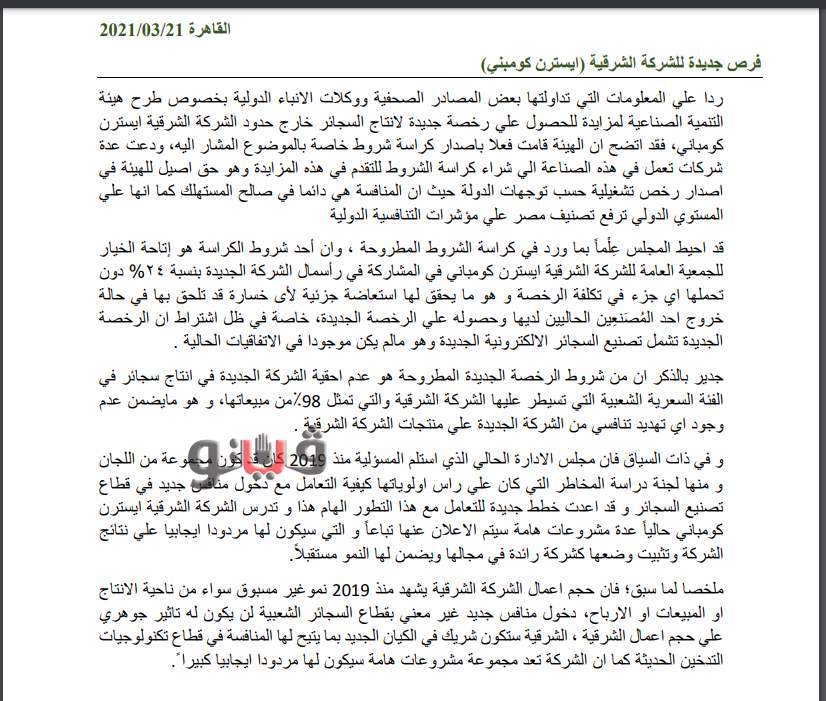 قالت شركة الشرقية - ايسترن كومباني، إن هيئة التنمية الصناعية أصدرت كراسة شروط خاصة بمزايدة للحصول على رخصة جديدة لإنتاج السجائر خارج حدود شركة الشرقية ايسترن كومباني.