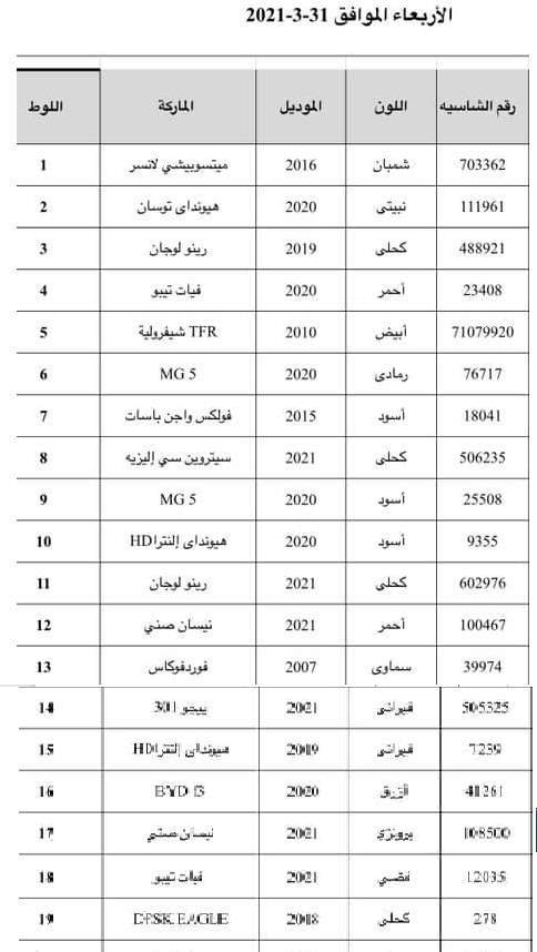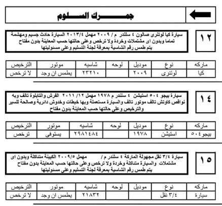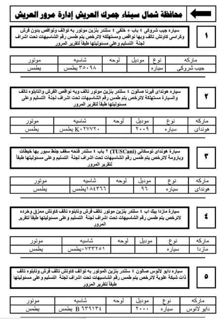 وستبدأ جلسة المزاد ظهراً وثمن كراسة الشروط 400 جنيه شاملة الدمغات وضريبة القيمة المضافة. وتشمل السيارات في مزاد جمرك شمال سيناء والعريش ومرور العريش :