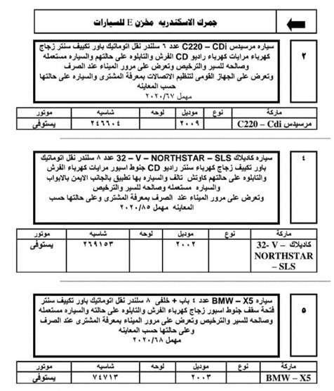 وستبدأ جلسة المزاد ظهراً وثمن كراسة الشروط 400 جنيه شاملة الدمغات وضريبة القيمة المضافة. وتشمل السيارات ضمن مزاد جمرك الإسكندرية: