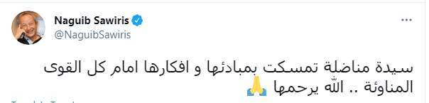 وكتب نجيب ساويرس ناعيًا نوال السعداوي عبر تويتر: "سيدة مناضلة تمسكت بمبادئها وأفكارها أمام كل القوى المناوئة .. الله يرحمها".
