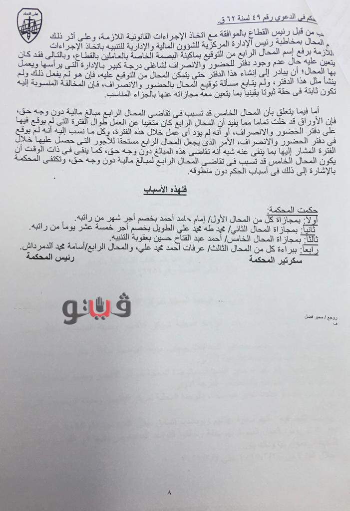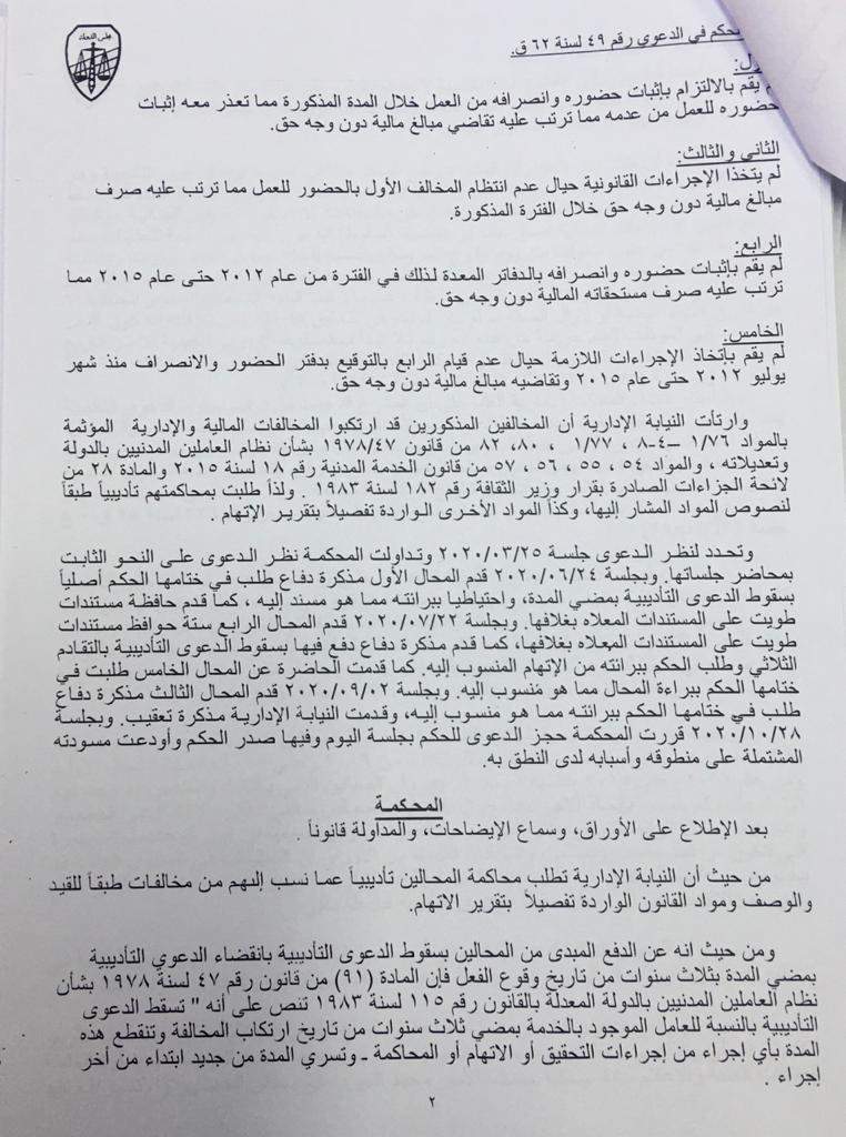 وأكدت المحكمة صحة ما جاء عبر تقرير الاتهام في القضية رقم 49 لسنة 62 قضائية عليا بأن المخالفين الثلاثة الصادر بحقهم حكم الإدانة خلال الفترة من عام 2006 حتى 2015 خرجوا على مقتضى الواجب الوظيفي ولم يخصصوا وقت العمل الرسمي لأداء واجبات الوظيفة ولم يحافظوا على مواعيد العمل الرسمية.