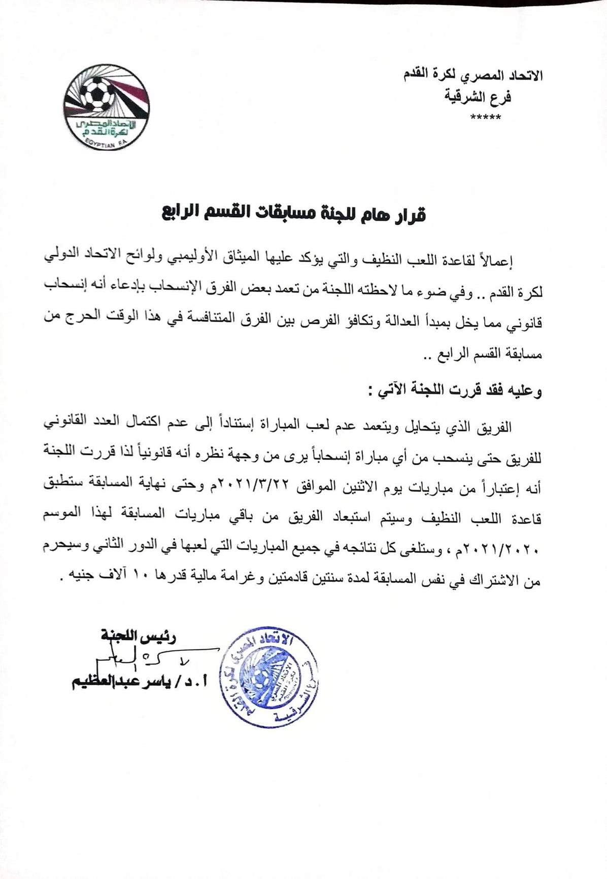 وقررت لجنة مسابقات القسم الرابع بمنطقة الشرقية لكرة القدم بقيادة الدكتور ياسر عبد العظيم، تطبيق مبدأ اللعب النظيف، واستبعاد أي فريق يلجأ لحيلة عدم اكتمل قائمة الفريق وعدم لعب المباريات، واستبعاد هذا الفريق من مباريات الموسم الجاري وحرمانه من المشاركة في البطولة لمدة موسمين.