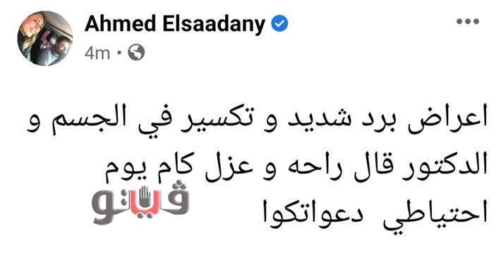 وكتب علي حسابه على موقع التواصل الإجتماعي "فيس بوك": "أعراض برد شديد وتكسير في الجسم، والدكتور قال راحة وعزل كام يوم احتياطي.. دعواتكوا".