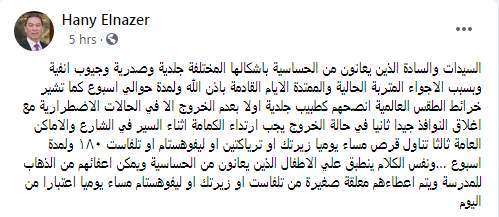 وكتب د. هاني الناظر تدوينة على الفيس بوك: "السيدات والسادة الذين يعانون من الحساسية بأشكالها المختلفة جلدية وصدرية وجيوب انفية وبسبب الأجواء المتربة الحالية والممتدة الأيام القادمة بإذن الله، ولمدة حوالي أسبوع، كما تشير خرائط الطقس العالمية.. أنصحهم كطبيب جلدية؛ أولا بعدم الخروج إلا في الحالات الاضطرارية مع إغلاق النوافذ جيدا".