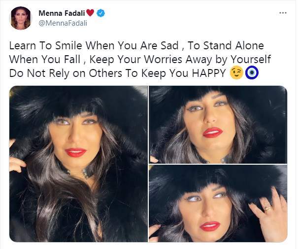 وكتبت منة فضالي تغريدة على تويتر قالت فيها : "تعلم أن تبتسم عندما تكون حزينًا، لتقف بمفردك عندما تسقط، ابقِ مخاوفك بعيدًا بنفسك ولا تعتمد على الآخرين لإبقائك سعيدًا".