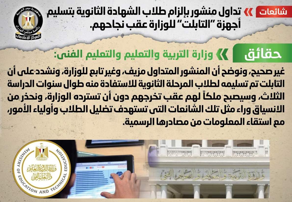 تداولت بعض المواقع الإلكترونية وصفحات التواصل الاجتماعي منشوراً بإلزام طلاب الشهادة الثانوية بتسليم أجهزة "التابلت" للوزارة عقب نجاحهم.
