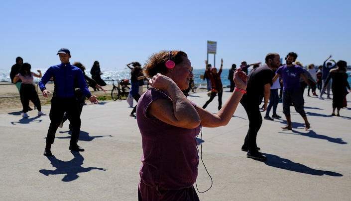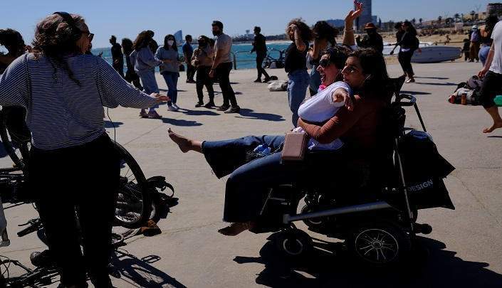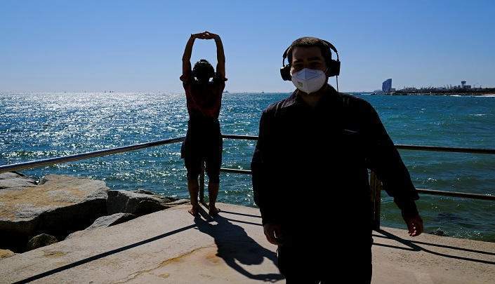 ورحب الناس، بأول أيام الربيع بوضع سماعات الأذن وأداء بعض الحركات الراقصة على شاطئ ماربيلا ببرشلونة مع التزام الجميع بقواعد التباعد الاجتماعي.