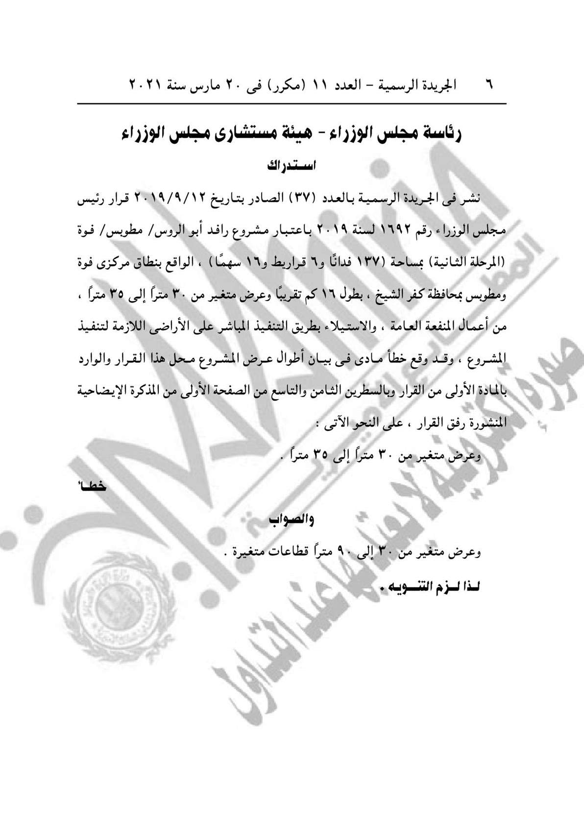 وينص الاستدراك، على نشر في الجريدة الرسمية بالعدد 37 الصادر بتاريخ 12/9/2019، والخاص بقرار رئيس الوزراء رقن 1692 لسنة 2019، باعتبار مشروع رافد أبو الروس/ مطوبس/ فوة (المرحلة الثانية) بمساحة 137 فدان و6 قراريط و16 سهمًا) الواقع بنطاق مركز فوة ومطوبس بمحافظة كفر الشيخ من أعمال المنفعة العامة.