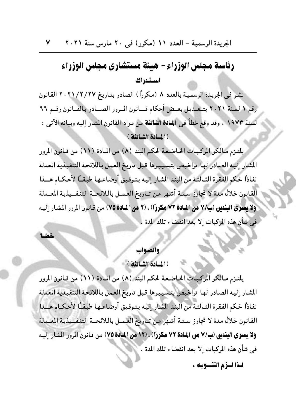 نشرت الجريدة الرسمية في عددها رقم 11 (مكرر) الصادر في 20 مارس 2021، استدراكين لرئاسة مجلس الوزراء هيئة مجلس الوزراء، بشأن المنفعة العامة، والآخر خطأ في المادة الثالثة بقانون المرور.