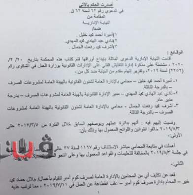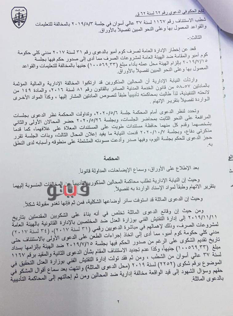 وجاء بأسباب الحكم أن أشرف محمد رفعت المحامي، لم يقم بإخطار الإدارة العامة لصرف كوم أمبو بالدعوى 31 لسنة 2017 مدني كلي كوم أمبو، والمقامة ضد الهيئة العامة لمشروعات الصرف جهة عمله؛ مما أدى إلى صدور حكم فيها بجلسة 15 يوليو 2019 بإلزام الهيئة بدفع 100 الف و570 جنيهًا للمدعين، وأصدرت المحكمة حكمها ببراءة المحالين الأول والثاني، وخصم 5 أيام من راتب الثالث.