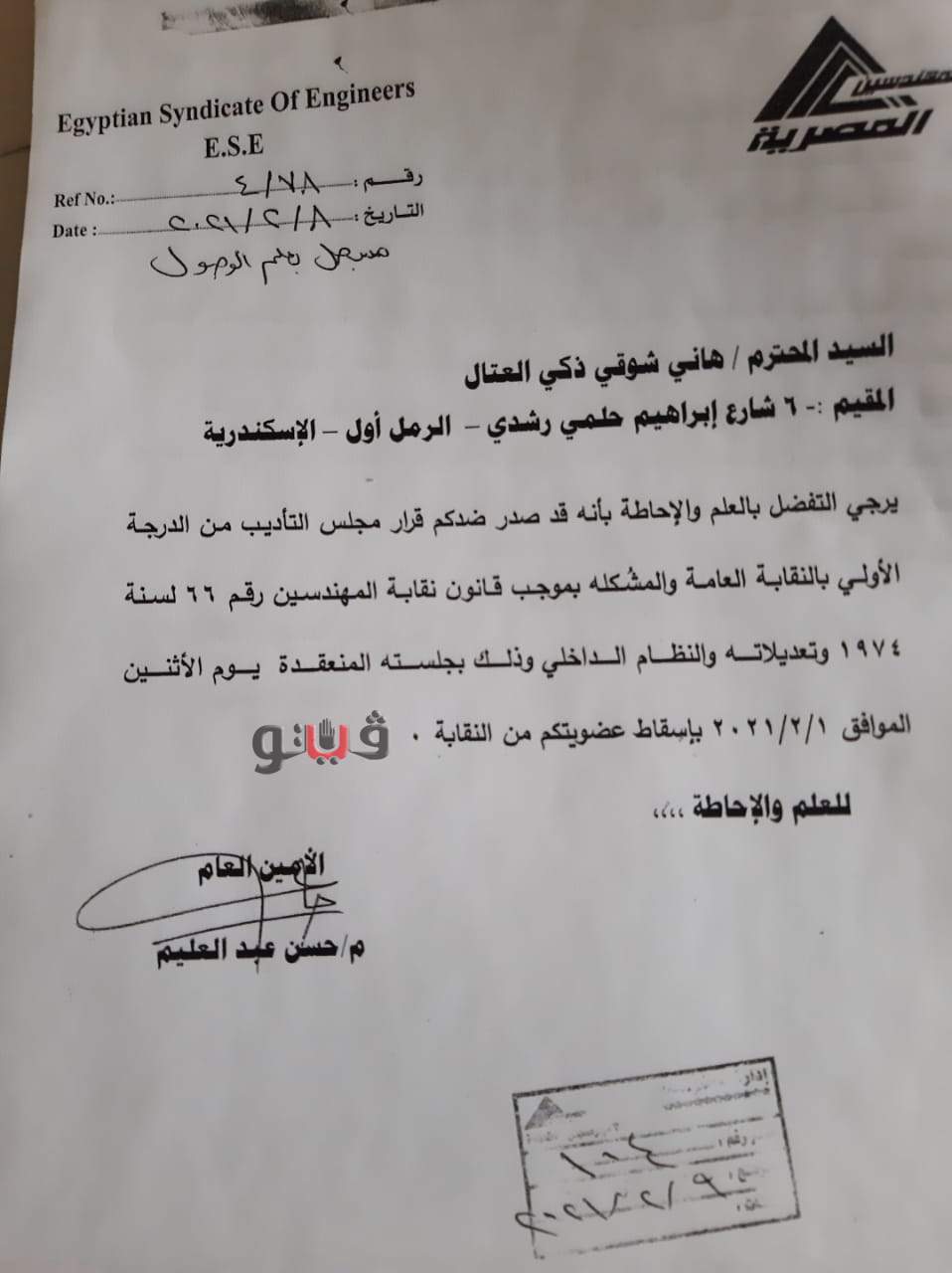 وأخطرت لجنة التأديب بالنقابة العامة للمهندسين المهندس المذكور أنه صدر ضده قرار مجلس التأديب من الدرجة الأولى بالنقابة العامة والمشكلة بموجب قانون نقابة المهندسين رقم 66 لسنة 1974 وتعديلاته والنظام الداخلي وذلك بجلسته المنعقدة يوم الإثنين الموافق 1 فبراير الماضي بإسقاط عضويته من النقابة.