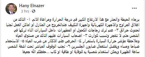 وكتب هاني الناظر تدوينة على الفيس بوك: "برجاء الحيطة والحذر مع هذا الارتفاع الكبير في درجة الحرارة ومراعاة الآتي: