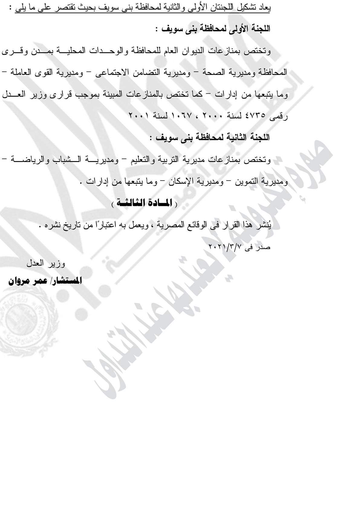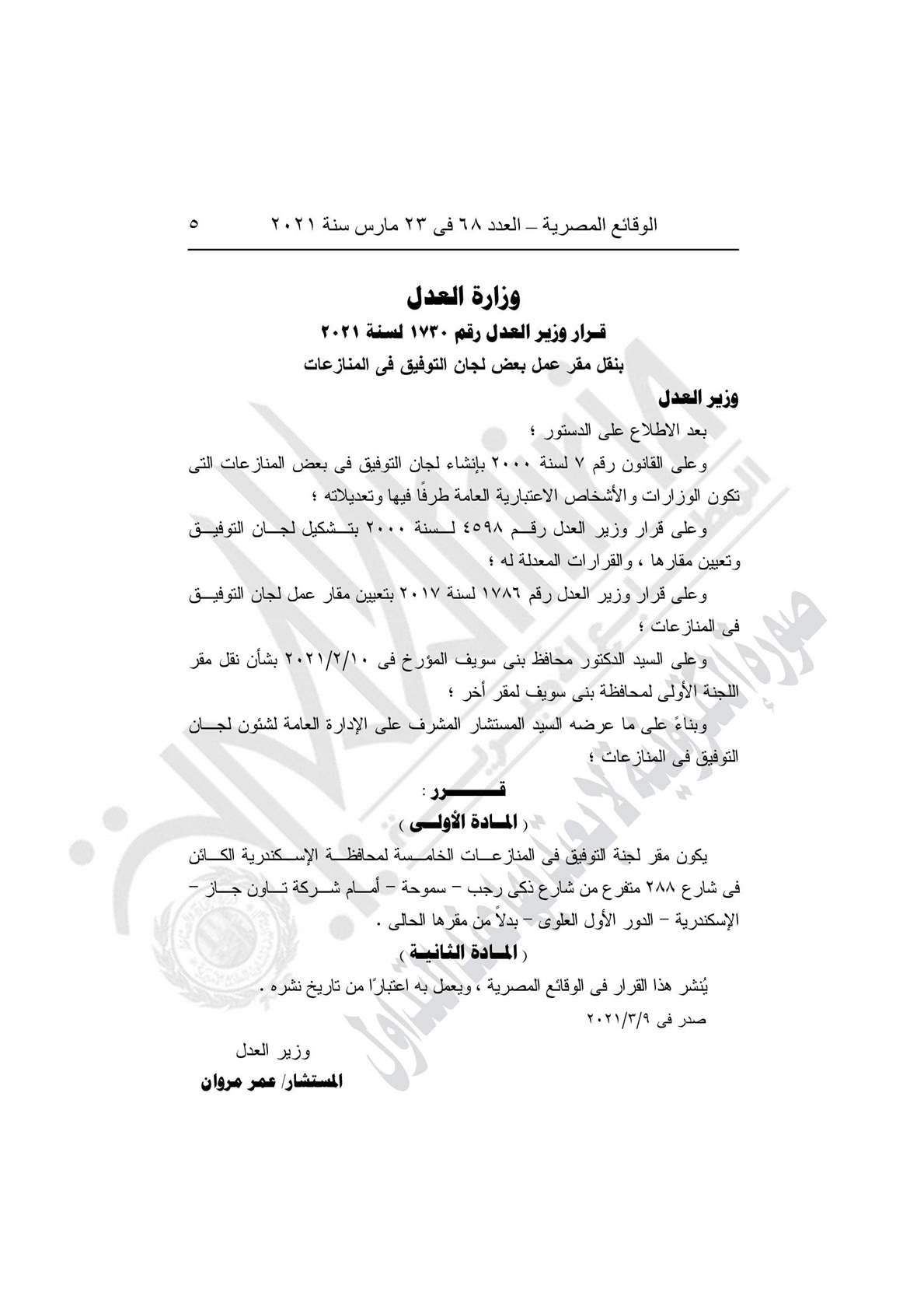 نشرت جريدة الوقائع المصرية في عددها رقم 68، الصادرة في 23 مارس 2021، قرارى وزير العدل المستشار عمر مروان بنقل مقر عمل بعض لجان التوفيق في المنازعات بنقل مقر لجنة التوفيق في المنازعات الأولى لمحافظة بني سويف، لجنة التوفيق في المنازعات الخامسة لمحافظة الإسكندرية.