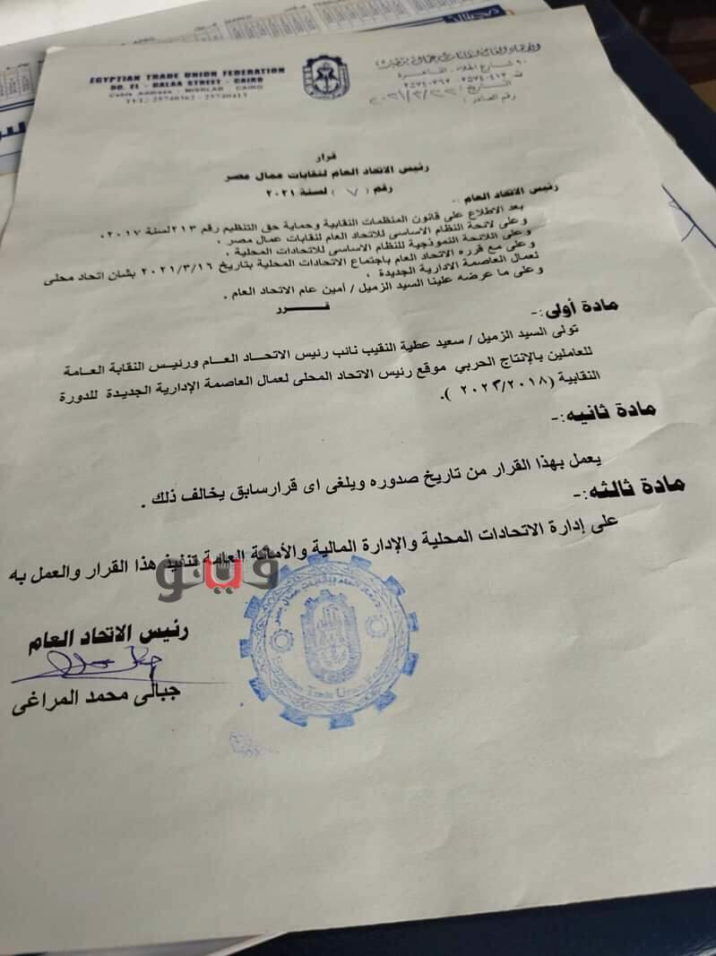 أصدر جبالي المراغي رئيس الاتحاد العام لنقابات عمال مصر قرار بتولي سعيد عطية النقيب نائب رئيس الاتحاد ورئيس نقابة العاملين بالإنتاج الحربي رئيسا للاتحاد المحلي للعاصمة الإدارية الجديدة.