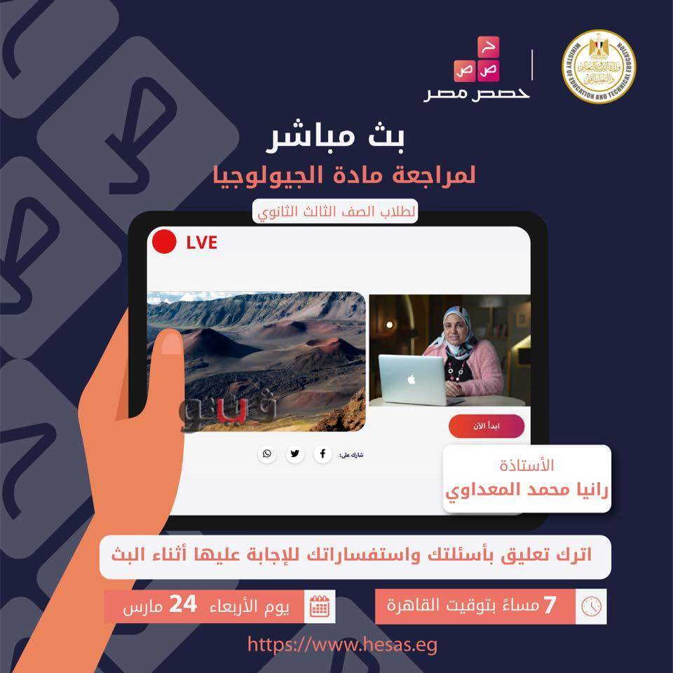 أعلنت وزارة التربية والتعليم والتعليم الفنى، عن موعد البث المباشر لجميع طلاب الثانوية العامة، لمراجعة مادة الجيولوجيا " يوم الأربعاء الموافق 24 مارس 2021 الساعة ٧:٠٠ مساء.