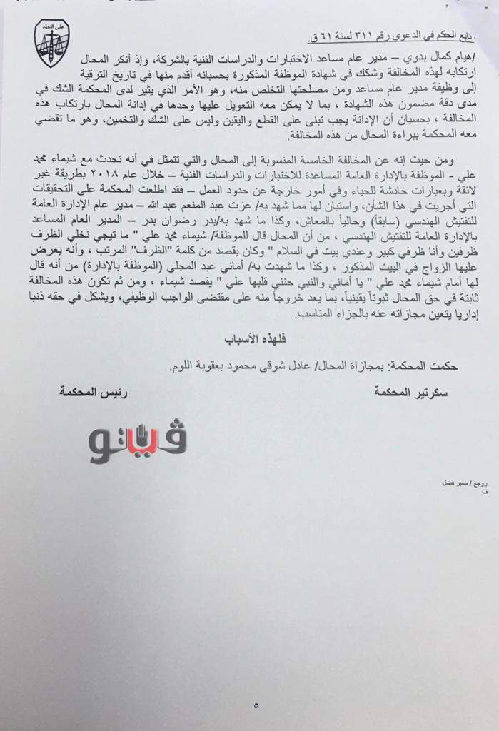 ومن حيث إنه عن المخالفة الخامسة المنسوبة إلى المحال والتي تتمثل في أنه تحدث مع المهندسة بطريقة غير لائقة وبعبارات خادشة للحياء وفي أمور خارجة عن حدود العمل – فقد اطلعت المحكمة على التحقيقات التي أجريت في هذا الشأن, واستبان لها مما شهد به عزت عبد المنعم عبد الله، مدير عام الإدارة العامة للتفتيش الهندسي حينذاك, وكذا ما شهد به بدر رضوان بدر، المدير العام المساعد بالإدارة العامة للتفتيش الهندسي, من أن المحال قال لها "ما تيجي نخلي الظرف ظرفين وأنا ظرفي كبير وعندي بيت في السلام".