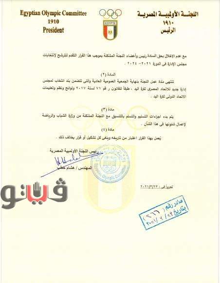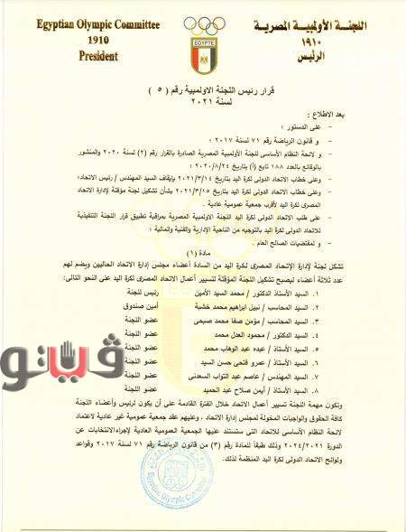 أصدر مسئولو اللجنة الأولمبية برئاسة المهندس هشام حطب، قرار بتشكيل اللجنة المؤقتة المكلفة بإدارة اتحاد كرة اليد.