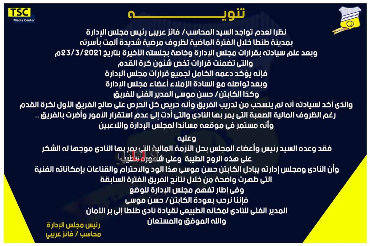 الرسمية للنادي يؤكد فيه النادي الطنطاوي عودة حسن موسي لتدريب الفريق الأول