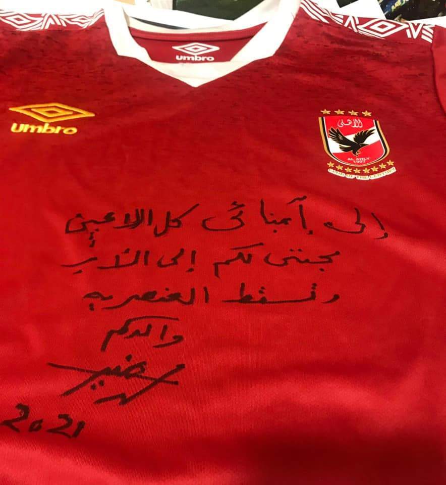 وأظهرت الصفحة توقيع محمد منير على التيشيرت حيث كتب: "إلى أبنائي كل اللاعبين محبتي لكم إلى الأبد وتسقط العنصرية.. محمد منير"، فيما علقت الصفحة على الصور قائلة: "دائماً في قلوبنا يا ملك".