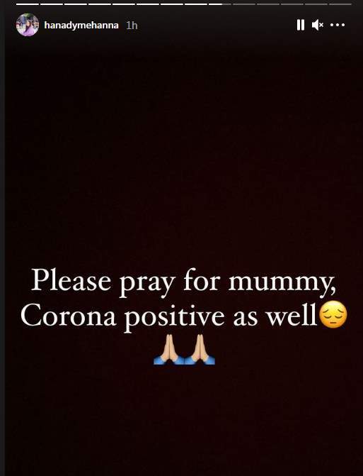 وكتبت هنادي مهنا عبر خاصية الإستوري قائلة: "ادعوا لماما إيجابي كورونا".