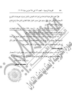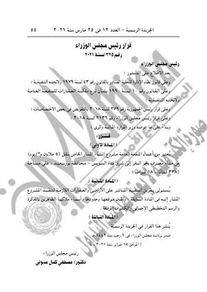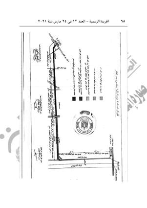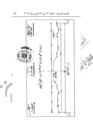 وجاء في المادة الثانية "يستولى بطريق التنفيذ المباشر على الأراضي والعقارات اللازمة لتنفيذ المشروع، والمبين موقعها وحدودها وأسماء ملاكها الظاهرية بالمذكرة والرسم التخطيطي الإجمالي والكشوف.