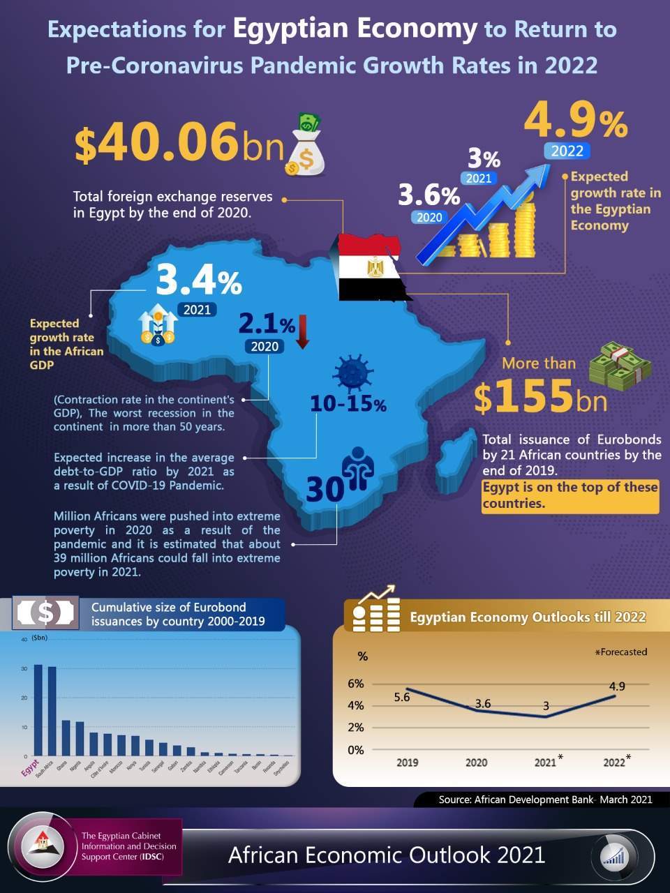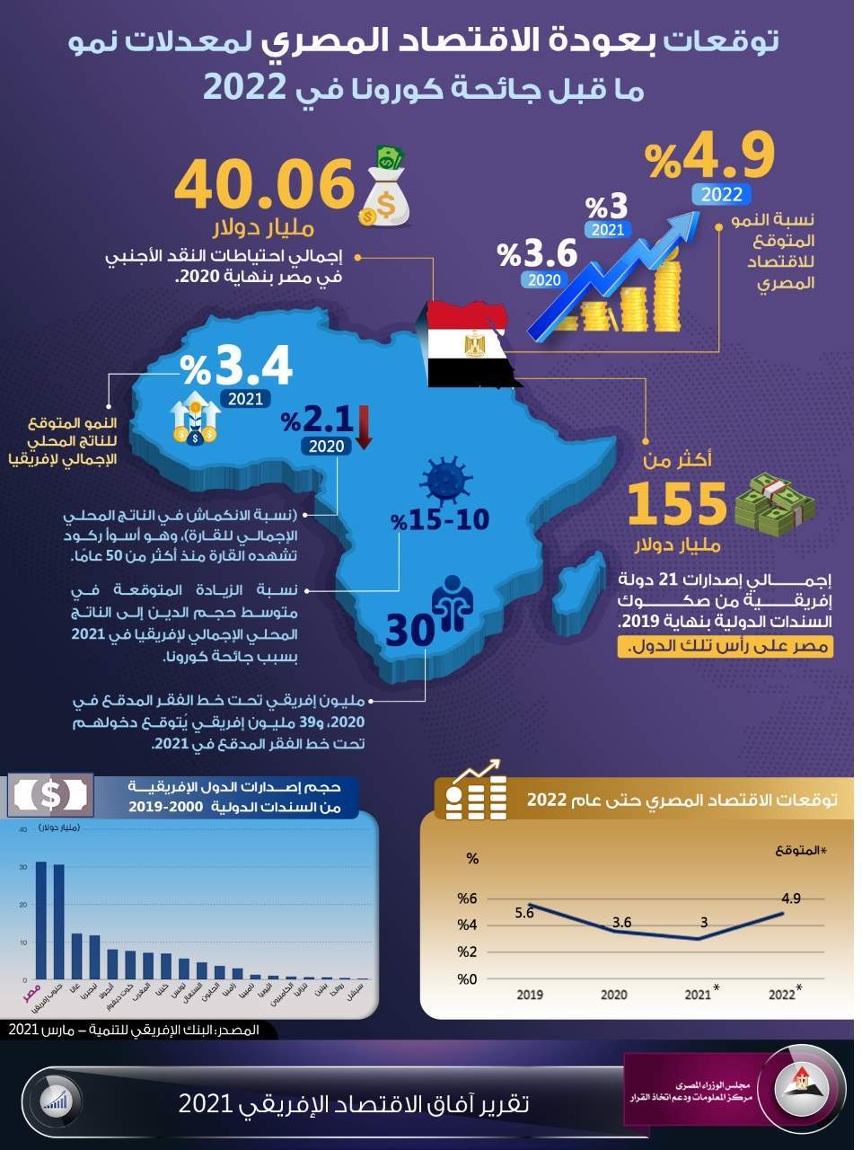 وتوقع البنك الإفريقي استعادة الاقتصاد المصري معدلات نمو ما قبل جائحة كورونا في 2022، بنسبة نمو 4.9%، مقابل 3% في 2021، و3.6% في 2020، و5.6% في 2019. مقارنة بأغلب الاقتصادات العالمية، كما وصل إجمالي احتياطات النقد الأجنبي لمصر إلى نحو 40.06 مليار دولار بنهاية 2020.