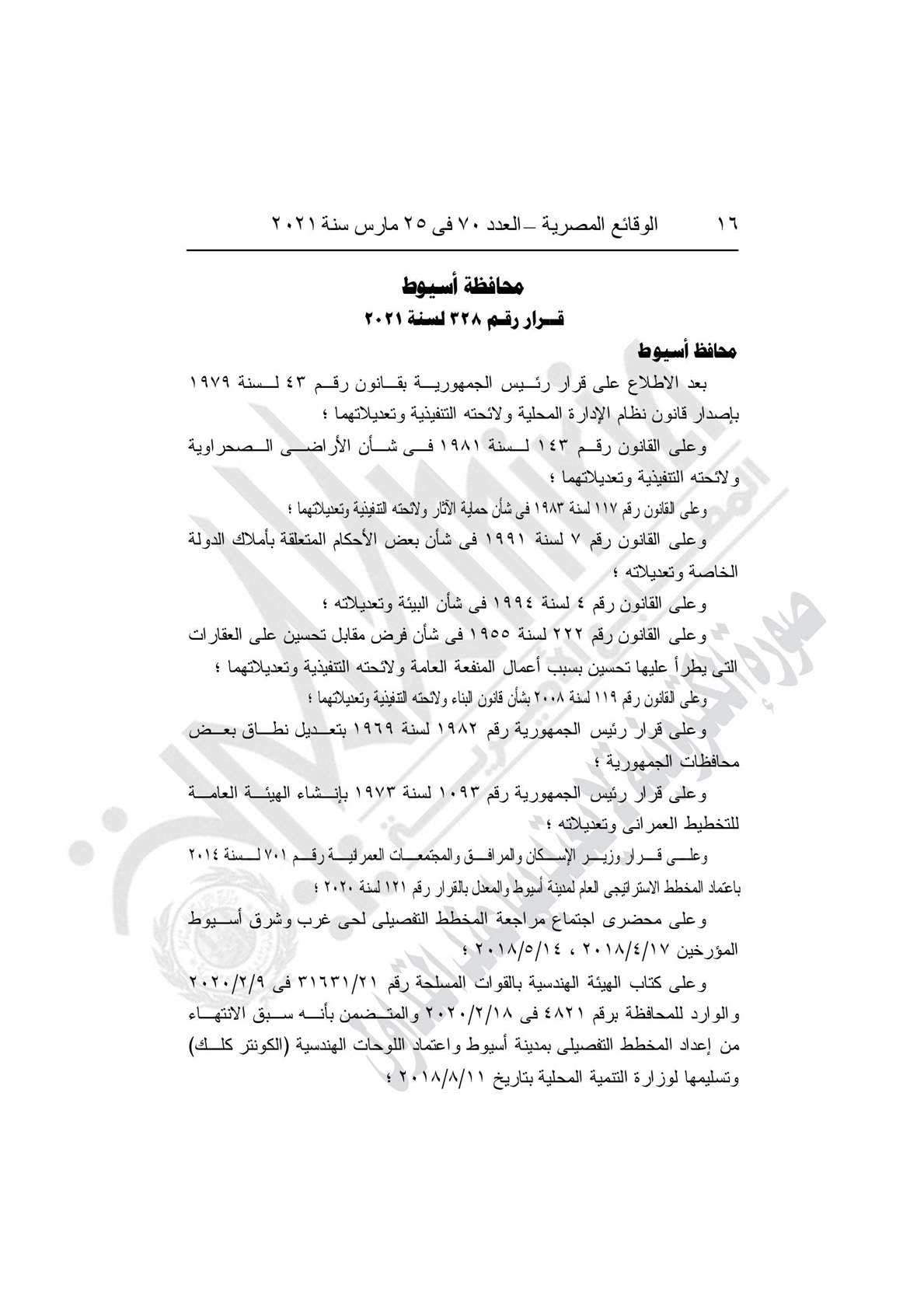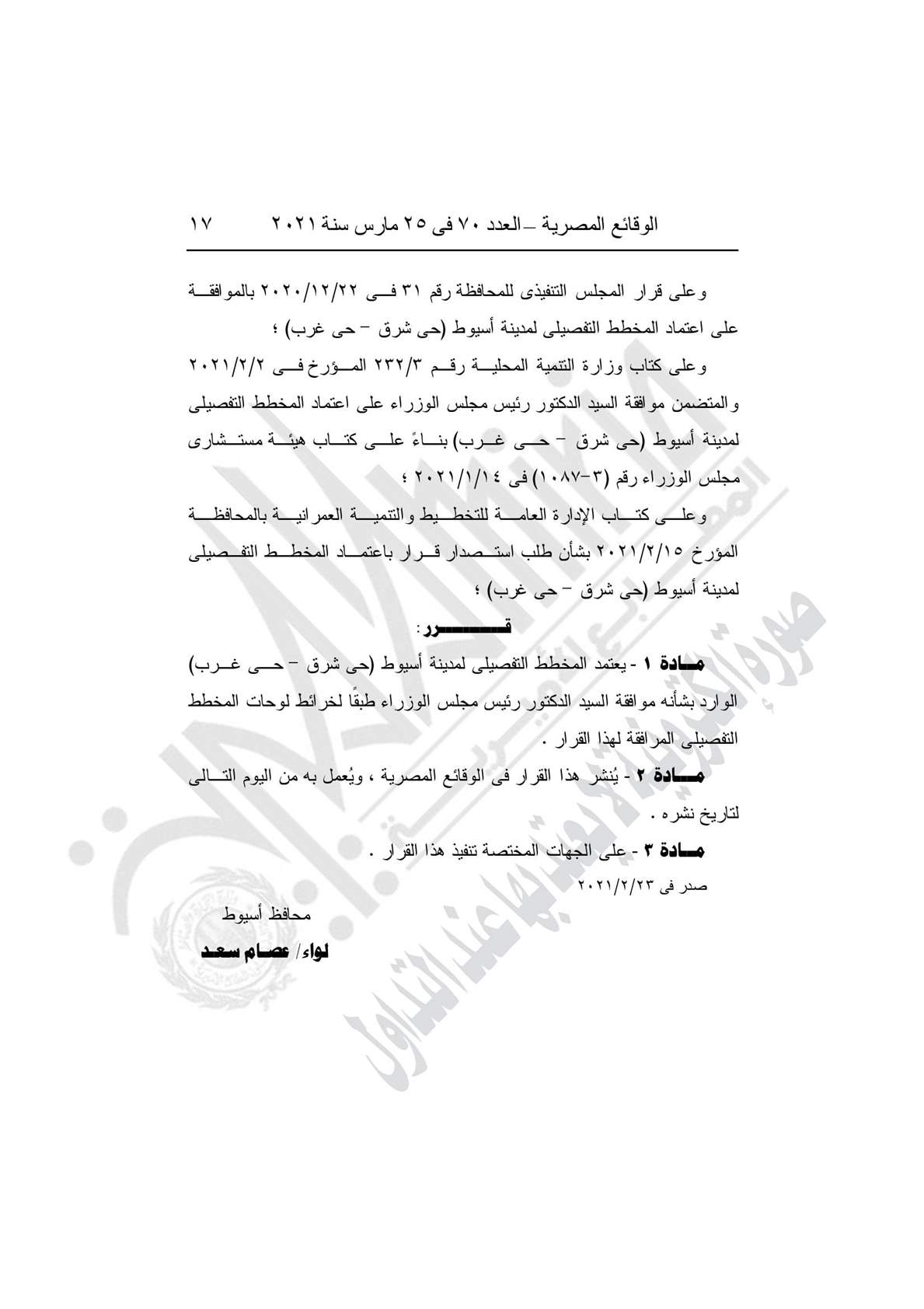 وجاء القرار بعد الاطلاع على قرار المجلس التنفيذي للمحافظة رقم 31 في 22/12/2020، بالموافقة على اعتماد المخطط التفصيلي لمدينة أسيوط (حي شرق- حي غرب)؛ وعلي كتاب وزارة التنمية المحلية رقم 3/232 المؤرخ في 2/2/2021، والمتضمن موافقة رئيس الوزراء على اعتماد المخطط التفصيلي لمدينة أسيوط، وعلى كتاب هيئة مستشاري مجلس الوزراء رقم (3-1087) في 14/1/2021.