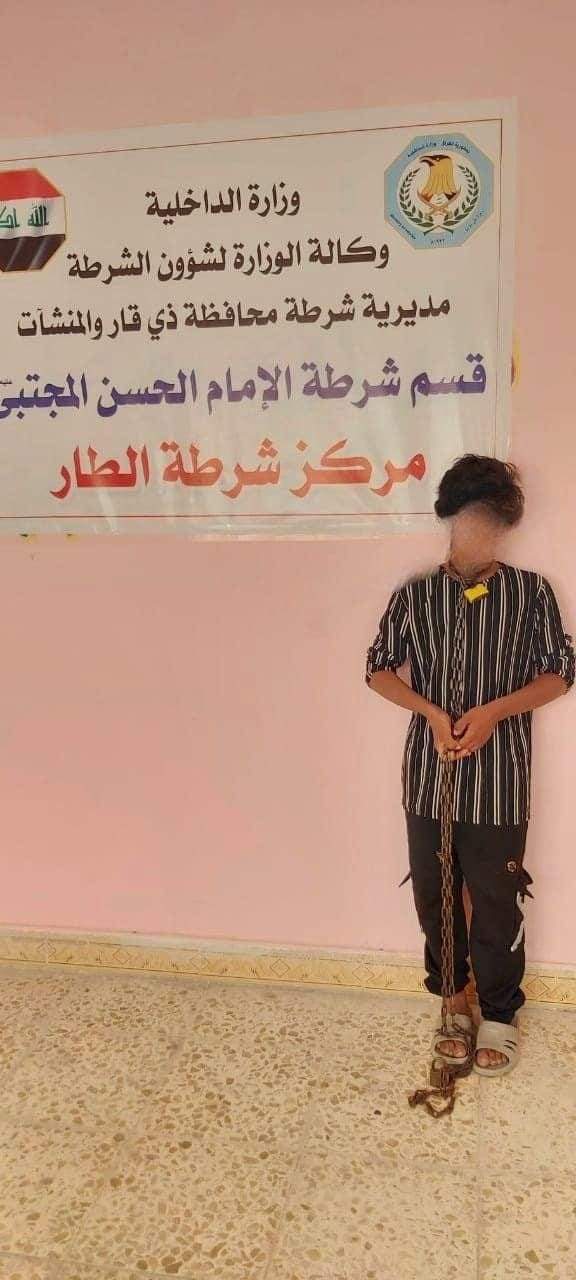 وقالت الشرطة في بيان: "إنه بناء على معلومات دقيقة تمكنت مديرية شرطة محافظة ذي قار الخميس، من تحرير حدث يبلغ من العمر 16 عامًا يسكن ناحية الطار، حيث كان سجينًا داخل منزل والده ومقيدًا بسلاسل حديدية منذ 6 أعوام من قِبل الأب".