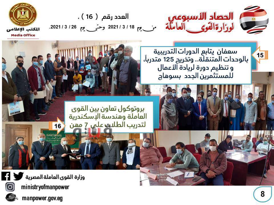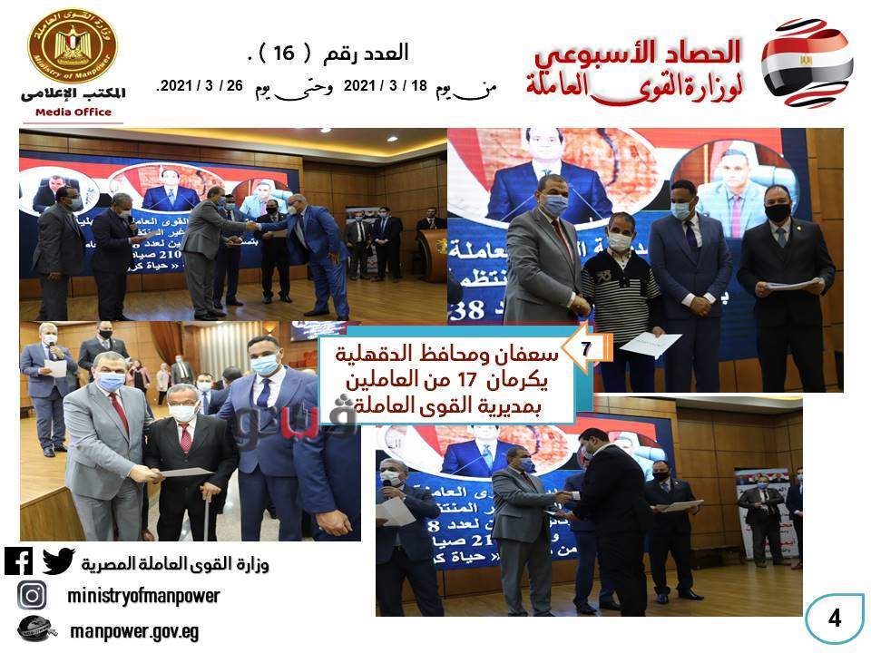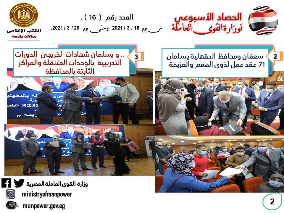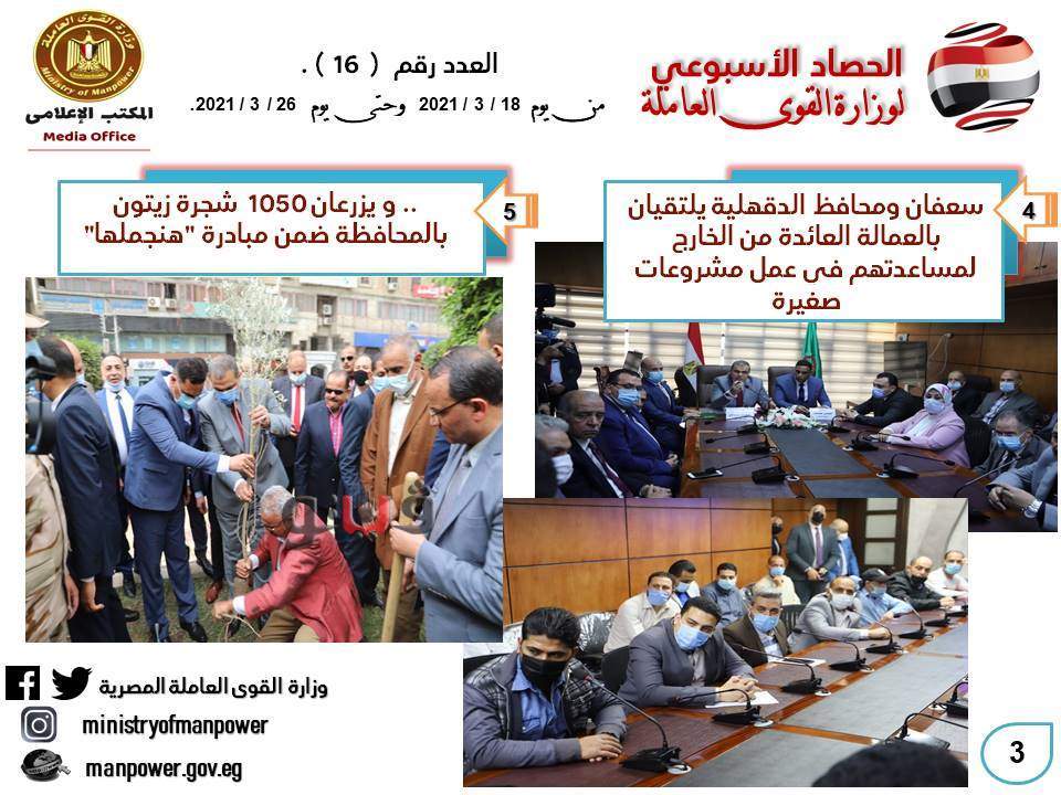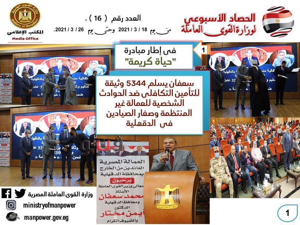 شهد حصاد الأسبوع الحالي، في وزارة القوى العاملة العديد من الأخبار المهمة - من 18 إلى 26 مارس الجاري- أهمها كان جولة وزير القوي العاملة محمد سعفان في محافظة الدقهلية لحضور احتفالية كبرى لتسليم 5344 بوليصة تأمين تكافلي للعمالة غير المنتظمة وصغار الصيادين ضد حالات العجز الكلي أو الجزئي أو الوفاة ، وتسليم شهادات إتمام التدريب لخريجي مراكز التدريب المهنى الثابتة والمتنقلة بالمحافظة ، وعقود عمل لذوي الهمم والعزيمة ، وزراعة أشجار بالمحافظة ضمن مبادرة هنجملها.