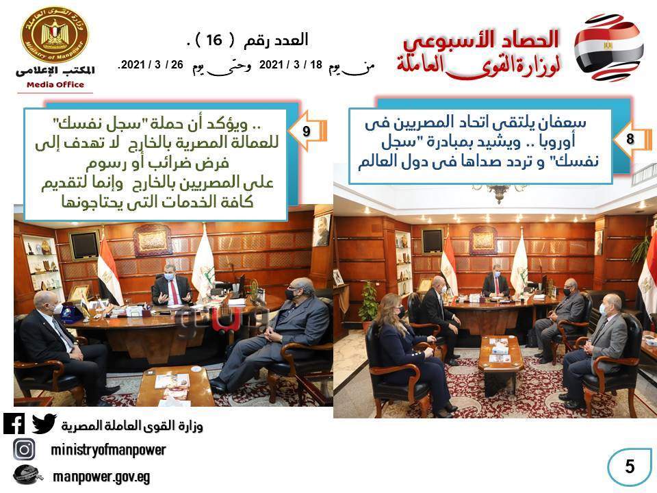 وتابع الوزير، مع مكاتب التمثيل العمالي بسفارات وقنصليات مصر بالخارج حملة "سجل نفسك" التي أطلقتها الوزارة لتسجيل العمالة المصرية بالخارج مما يتيح لكل جهات الدولة المصرية الاطلاع على احتياجاتهم وإزالة أي عائق أمامهم وتسهيل الاتصال السريع بهم وتقديم كافة الخدمات التي يحتاجونها .
