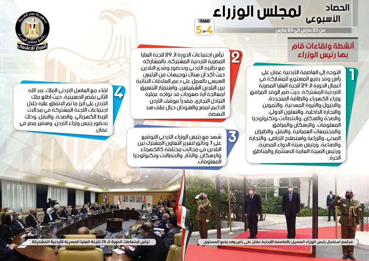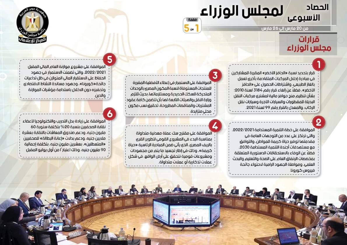 نشر المركز الإعلامي لمجلس الوزراء، تقريراً شمل إنفوجرافات سلط من خلالها الضوء على الحصاد الأسبوعي لمجلس الوزراء، وذلك خلال الفترة من من 20 مارس إلى 26 مارس 2021، والذي تضمن الموافقة على عدد من القرارات، والاجتماعات واللقاءات التي عقدها الدكتور مصطفي مدبولي، رئيس مجلس الوزراء، بالإضافة إلى ما قام به من أنشطة.
