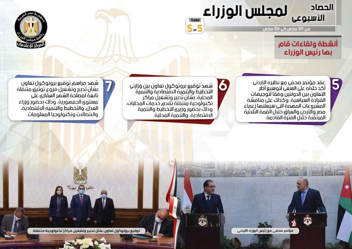 واستكمالاً لأنشطة رئيس مجلس الوزراء، فقد شهد الدكتور مصطفى مدبولي مع رئيس الوزراء الأردني التوقيع على 7 وثائق لتعزيز التعاون المشترك بين البلدين في مجالات مختلفة كالكهرباء والإسكان، والآثار، والاتصالات وتكنولوجيا المعلومات، بالإضافة إلى عقد مؤتمر صحفي مع نظيره الأردني أكد خلاله على السعي لتوسيع أطر التعاون بين الدولتين وفقا لتوجيهات القيادة السياسية، وكذلك على مناقشة المشروعات المهمة التي سيعلنها زعماء مصر والأردن والعراق خلال القمة الثلاثية المرتقبة خلال الفترة القادمة، وكذلك شهد توقيع بروتوكول تعاون بين وزارتي التخطيط والتنمية الاقتصادية والتنمية المحلية، بشأن تدبير وتشغيل مراكز تكنولوجية متنقلة تقدم خدمات المحليات، وذلك بحضور وزيري التخطيط والتنمية الاقتصادية، والتنمية المحلية.