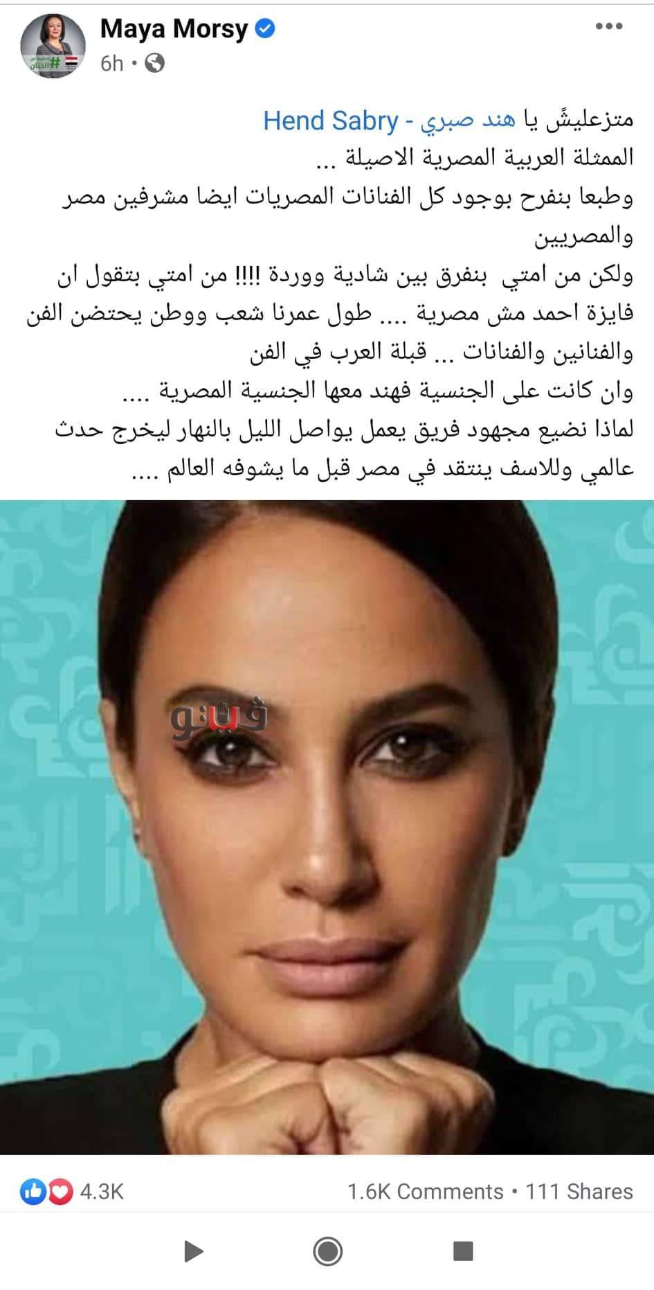 ووجهت الدكتورة مايا مرسى، رسالة إلى الفنانة هند صبرى عبر صفحتها الرسمية بموقع التواصل الاجتماعى"فيس بوك"، وقالت :" ما تزعليش ياهند صبرى، الفنانة العربية المصرية الأصيلة.