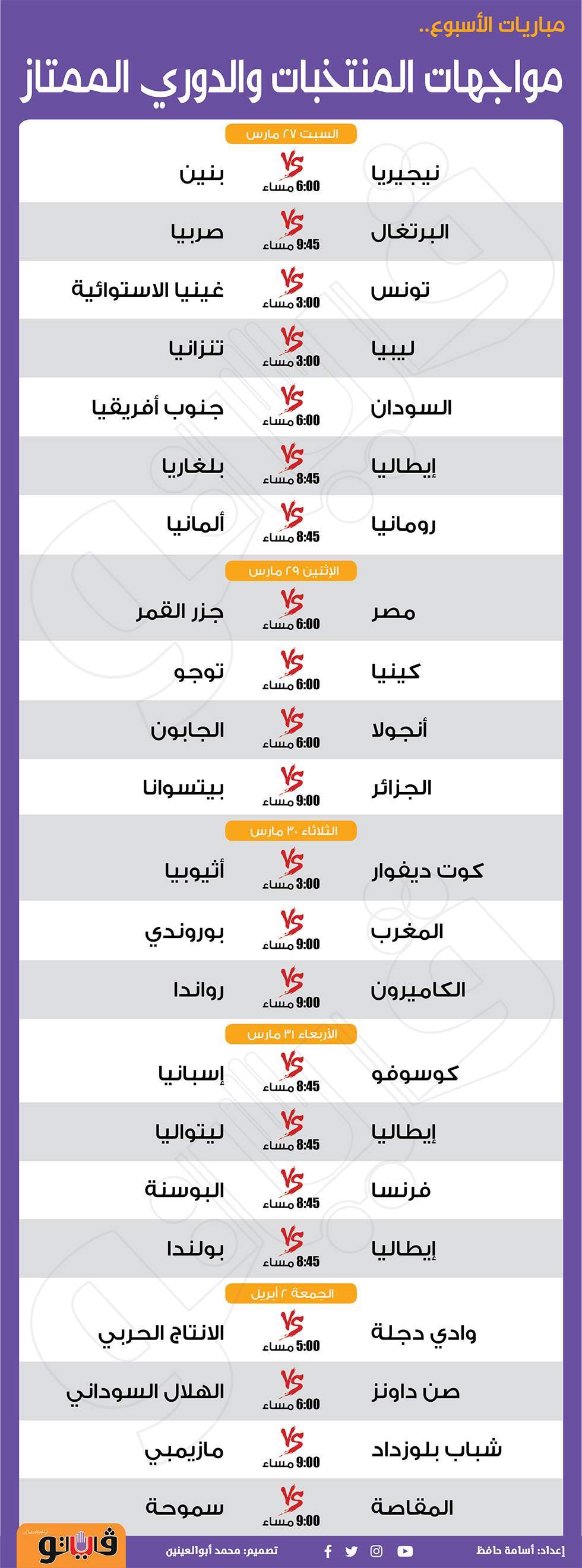 مباريات الأسبوع.. مواجهات المنتخبات والدوري الممتاز السبت 27/مارس/2021 - 11:41 ص 3/27/2021 11:41:59 AM مباريات الأسبوع أسامة حافظ شارك طباعة 18 حجم الخط شارك طباعة منتخب مصر مباريات الاسبوع مواعيد مباريات الأسبوع