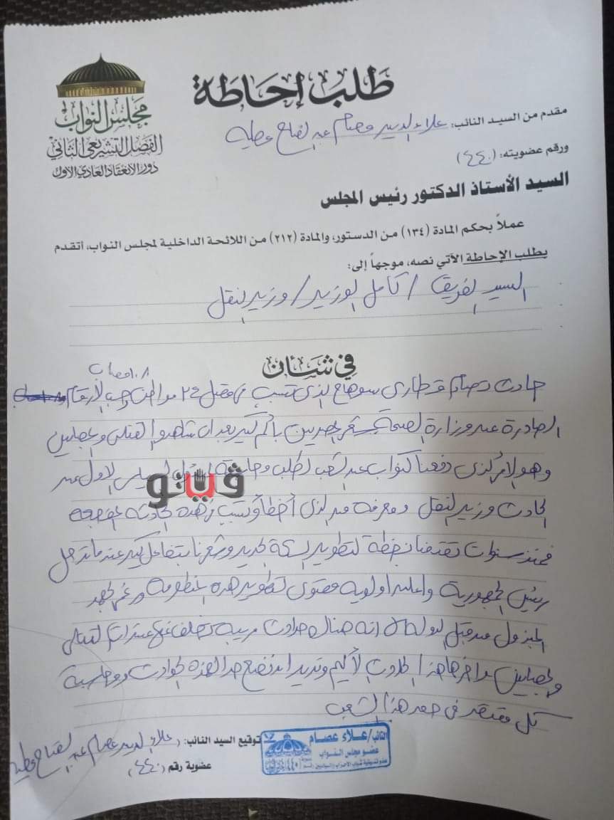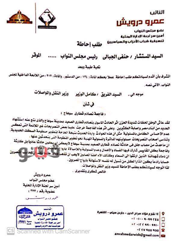 تقدم نائبان بمجلس النواب منتميان لتنسيقية شباب الأحزاب، بطلبين إحاطة إلى رئيس مجلس النواب المستشار الدكتور حنفي جبالي رئيس المجلس، موجهان لوزير النقل، بشأن حادث تصادم قطاري سوهاج.