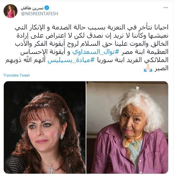 وكتبت نسريت طافش تغريدة على تويتر قالت فيها: "أحيانا نتأخر في التعزية بسبب حالة الصدمة والإنكار التي نعيشها وكأننا لا نريد أن نصدق لكن لا اعتراض على إرادة الخالق والموت علينا حق السلام لروح أيقونة الفكر والأدب العظيمة ابنة مصر #نوال_السعداوي وأيقونة الإحساس الملائكي الفريد ابنة سوريا #ميادة_بسيليس ألهم الله ذويهم الصبر".