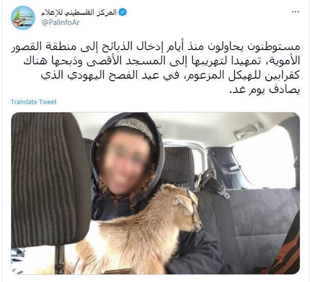 وكتب المركز الفلسطيني للإعلام تغريدة على تويتر قال فيها "مستوطنون يحاولون منذ أيام إدخال الذبائح إلى منطقة القصور الأموية، تمهيدا لتهريبها إلى المسجد الأقصى وذبحها هناك كقرابين للهيكل المزعوم، في عيد الفصح اليهودي الذي يصادف يوم غد".