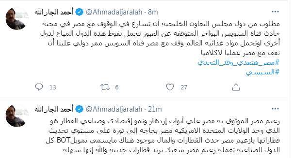 وكتب أحمد الجار الله تغريدة على تويتر: "زعيم مصر الموثوق به .. مصر علي أبواب إزدهار ونمو إقتصادي.. وصناعة القطار وحد الولايات المتحده الامريكيه .. مصر بحاجه إلي ثوره علي مستوي تحديث قطاراتها ..يا زعيم مصر حدث القطارات والمال موجود هناك مايسمي تمويلBOT كل الدول الصناعيه تعمله.. زعيم مصر شعبك يريد قطارات حديثه والله إنها سهلة".