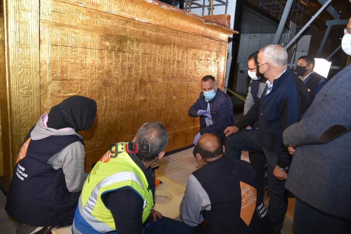 أمين "الأعلى للآثار" يتفقد أعمال تثبيت قطع توت عنخ آمون بالمتحف الكبير