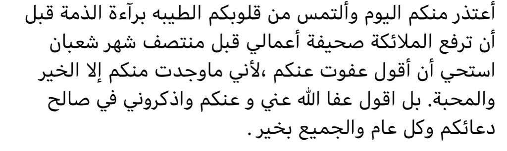 وكتب زكريا، عبر صفحته الشخصية على موقع التدوينات القصيرة "تويتر": "أعتذر منكم اليوم وألتمس من قلوبكم الطيبة براءة الذمة قبل أن ترفع الملائكة صحيفة أعمالي قبل منتصف شهر شعبان، أستحي أن أقول عفوت عنكم، لأني ما وجدت منكم إلا الخير والمحبة، بل أقول عفا الله عني وعنكم واذكروني في صالح دعائكم وكل عام والجميع بخير".