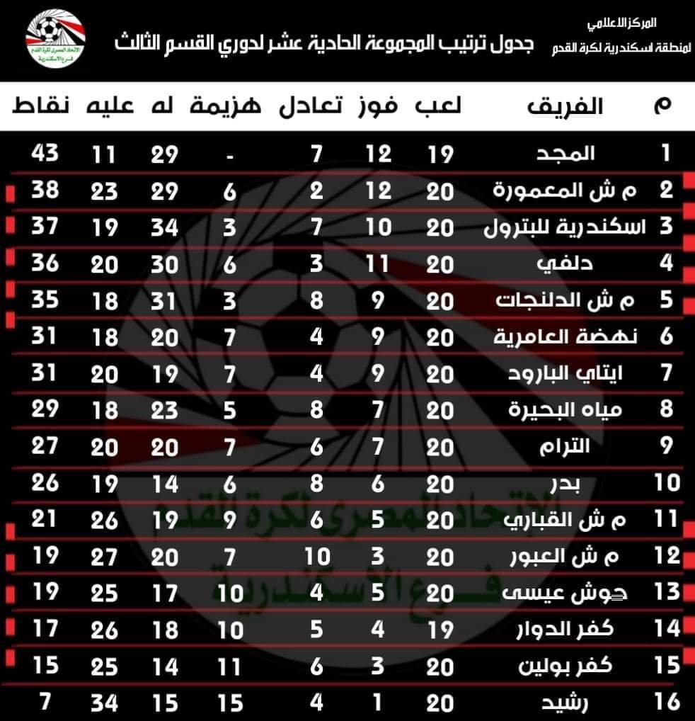 ويحتل فريق المجد قمة جدول ترتيب دوري القسم الثالث بالمجموعة الحادية عشرة التي ينظمها فرع الإسكندرية بمشاركة أندية الإسكندرية والبحيرة.