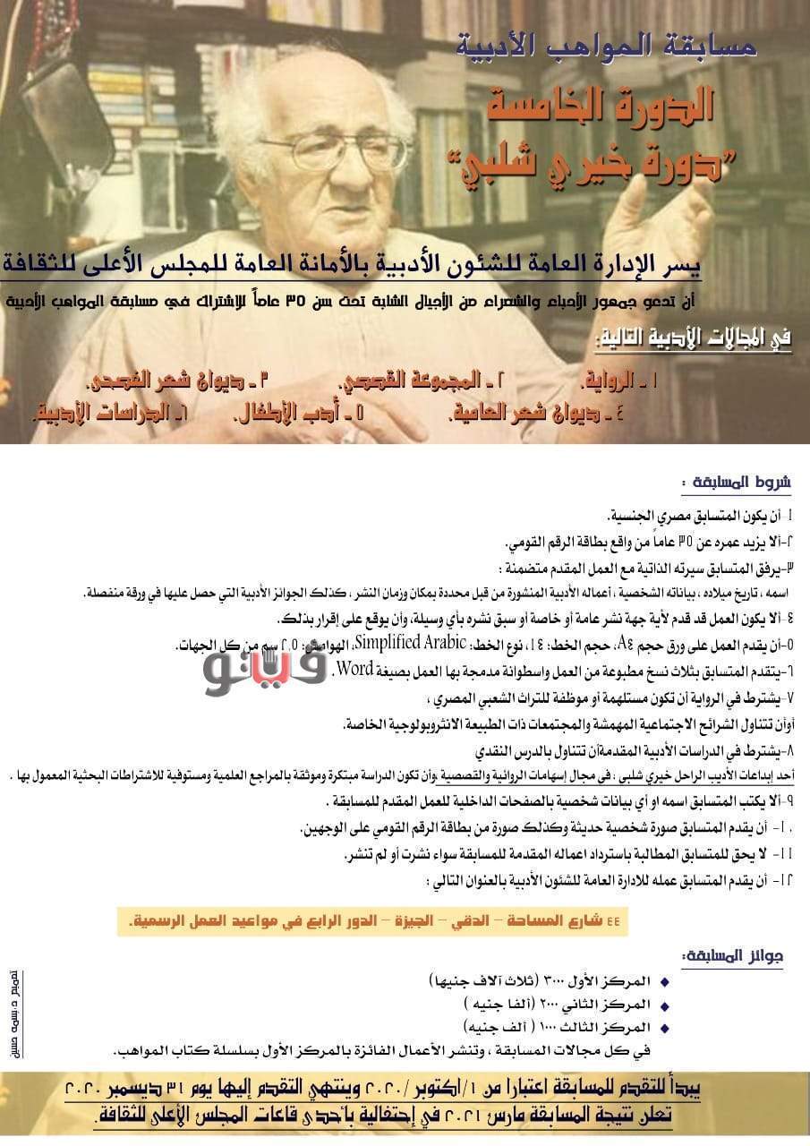 ينظم المجلس الأعلى للثقافة، بأمانة الدكتور هشام عزمي، و بالتعاون مع الإدارة المركزية للشئون الأدبية والمسابقات برئاسة الدكتورة إيمان نجم، حفل توزيع جوائز مسابقة المواهب الأدبية لعام 2020 دورة خيري شلبي.