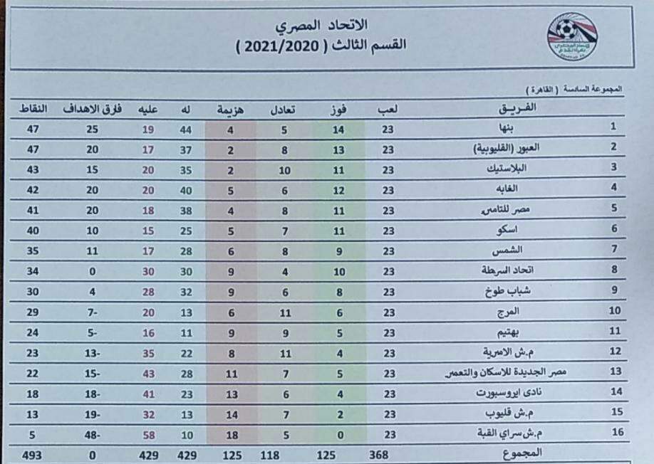 أعلنت منطقة القاهرة لكرة القدم بقيادة حمادة الشربيني، جدول ترتيب المجموعة السادسة بدوري القسم الثالث بعد انتهاء الجولة الـ 23 بمشاركة 16 فريقا.