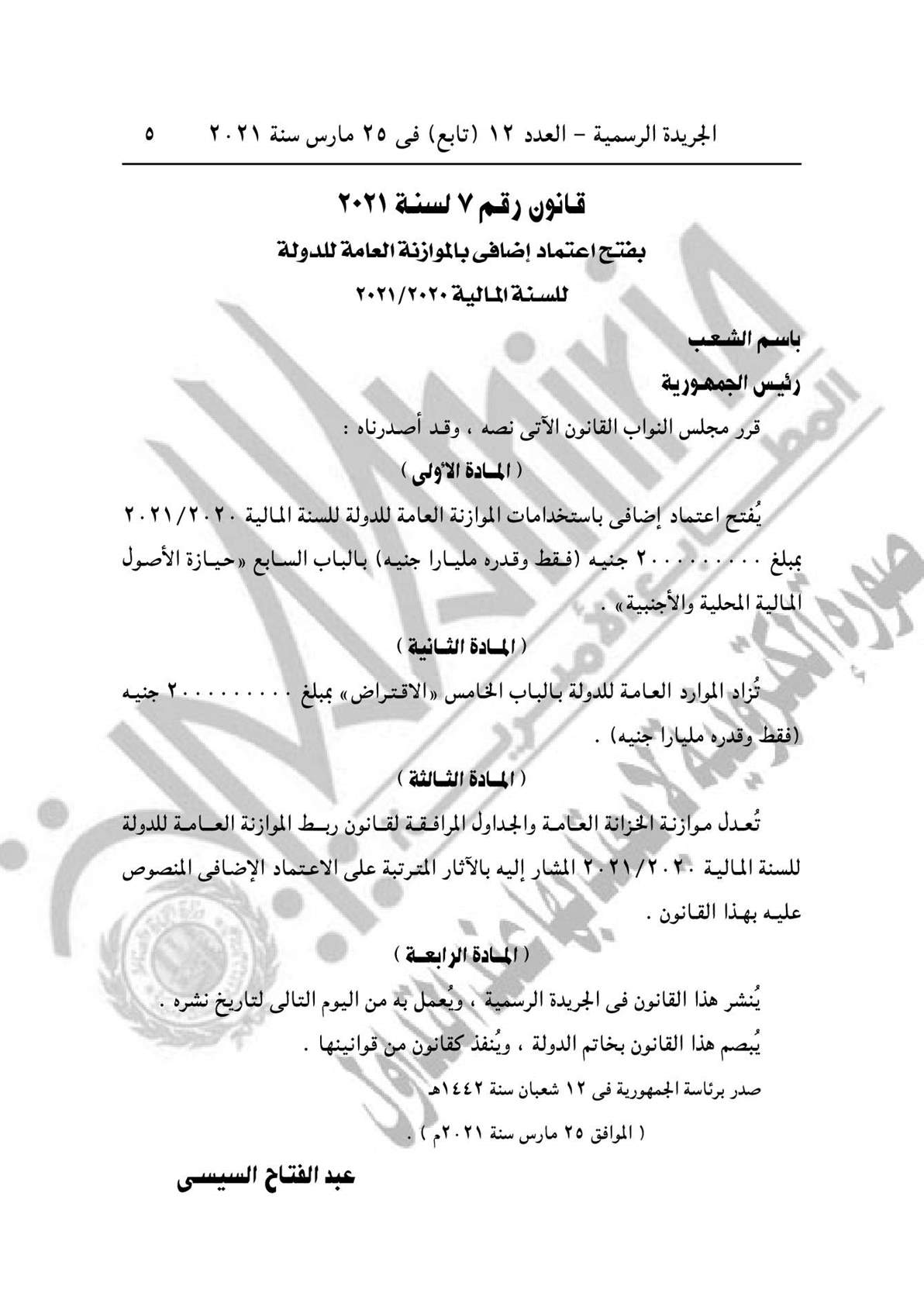 نشرت الجريدة الرسمية في عددها رقم 12 (تابع)، الصادر في 25 مارس 2021، تصديق الرئيس عبد الفتاح السيسي على القانون رقم 7 لسنة 2021، بفتح اعتماد إضافي بالموازنة العامة للدولة للسنة المالية 2020/2021.