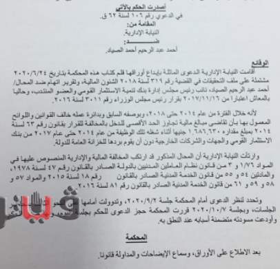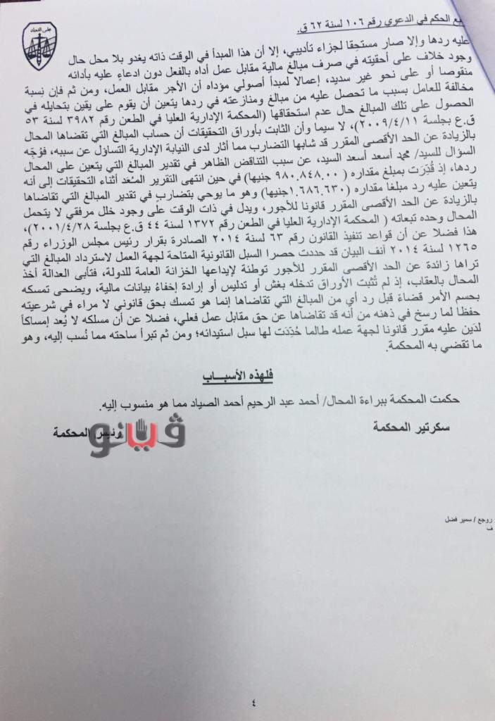 وقالت المحكمة "إن المخالفة المنسوبة للمحال أحمد عبد الرحيم الصياد، نائب رئيس مجلس إدارة بنك الاستثمار القومي والعضو المنتدب السابق تتمثل في عدم رده المبالغ الزائدة عن الحد الأقصى المقرر بالقانون رقم 63 لسنة 2014، لدخول للعاملين لدى أجهزة الدولة أو من أموال الهيئات والشركات التابعة لها سواء كان العامل شاغلاً لوظيفة دائمة أو مؤقتة أو مستشاراً أو خبيراً وطنياً، وسواء كان ما يتقاضاه من جهة عمله الأصلي أو من أية جهة أخرى بصفة مرتب أو أجر أو مكافأة لأي سبب كان أو حافز أو أجر إضافي أو جهود غير عادية أو بدل أو مقابل حضور جلسات مجالس إدارة أو لجان المقرر.