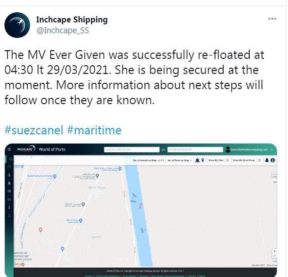 وذكرت "إنش كيب" للخدمات البحرية، في تغريدة على تويتر، أن عمليات إعادة تعويم السفينة نجحت في الساعة 4:30 فجرًا بالتوقيت المحلي، وأنه يجري حاليًا تأمينها.
