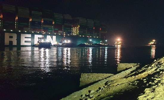 وفجر اليوم الإثنين، بدأت مناورات الشد لتعويم سفينة الحاويات البنمية الجانحة بقناة السويس بواسطة ١٠ قاطرات عملاقة.