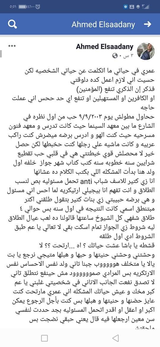 وتابع: "أنا كنت زي كتير للأسف شباب anti تحمل مسئولية بص لنسب الطلاق وأنت تفهم انا بيجيلي ارتيكريه لما أحس إني مسئول وهي برضه حبيبتي زي بنات كتير بتقول طلقني اكتر مبتنطق اسمي كانت النتيجة في أول سنة بس حوالي ٤ طلاق شفهي كل الشيوخ ساعتها قالولنا ده لعب عيال الطلاق ليه شروط زي الجواز تمام اسكت بقي لا تعالي يا عم طبق الشروط ادي اول طلقه.. قشطه يا باشا عشت حياتك ؟ اه ...ارتحت ؟؟ لا".